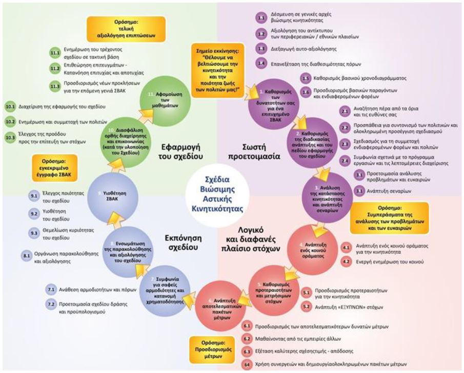 Σύμφωνα με τις Οδηγίες για την εκπόνηση και υλοποίηση των ΣΒΑΚ «Ανάπτυξη και Εφαρμογή ενός Σχεδίου Βιώσιμης Αστικής Κινητικότητας» (Guidelines: Developing and Implementing a Sustainable Urban Mobility Plan, 2013) του ΕLTIS, τα ΣΒΑΚ υλοποιούνται μέσα από μία διαδικασία 4 φάσεων, 11 βημάτων και 32 δράσεων που αποτελούν μέρος ενός συνεχούς κύκλου σχεδιασμού και διαδικασίας συνεχούς βελτίωσης. Τα εκπονούμενα ΣΒΑΚ οφείλουν να ακολουθήσουν τη διαδικασία που περιγράφεται στις Ευρωπαϊκές Οδηγίες. Τα διάφορα βήματα, οι φάσεις και οι δραστηριότητες ενός ΣΒΑΚ παρουσιάζονται συνοπτικά στον Κύκλο του ΣΒΑΚ.